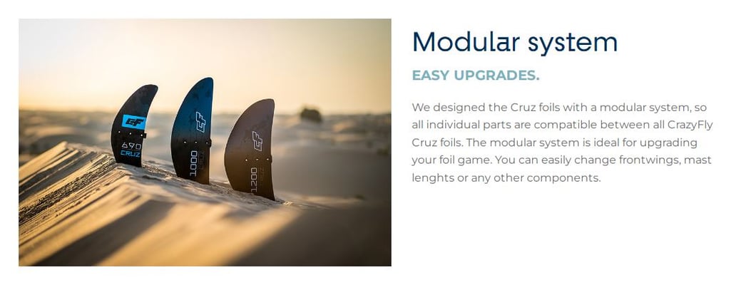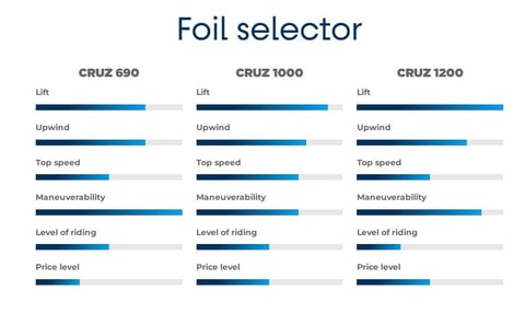 Avec le développement de la gamme de foils Cruz, nous proposons désormais trois options d’ailes spécifiques au kite foil: 690, 1000 et 1200 cm2. La gamme de foils Cruz est modulaire, elle permet donc d’échanger les ailes avant qui correspondent à votre style et de rester avec vous à mesure que vous progressez.