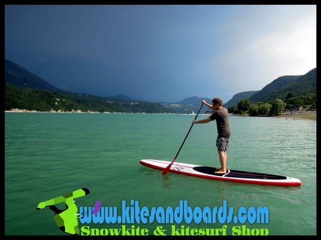 Vous souhaitez tester un sup gonflable avant de vous lancer dans un achat : un parc matos de 4 Stand Up Paddle Surfpistols vous attend au lac de Monteynard, sur le spot,à 20 mêtres de la plage.